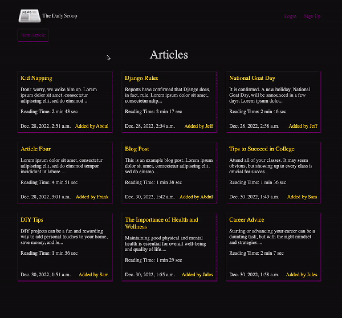 The Daily Scoop is built using Django. Users are able to sign up, log in, and add their own blogs to the site. They can also view and read others' blogs on the site.